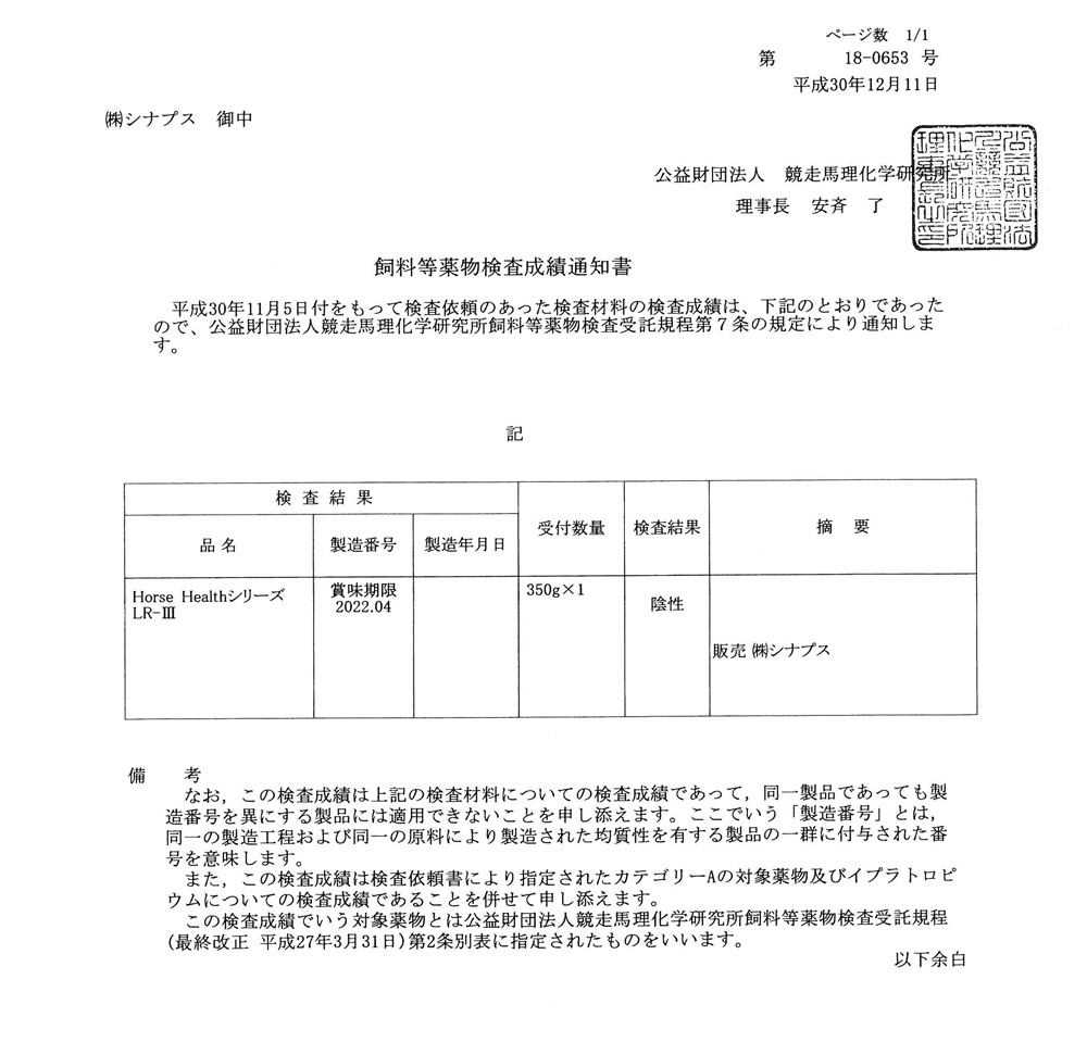 公益財団法人競走馬理化学研究所による飼料等禁止薬物検査済です。